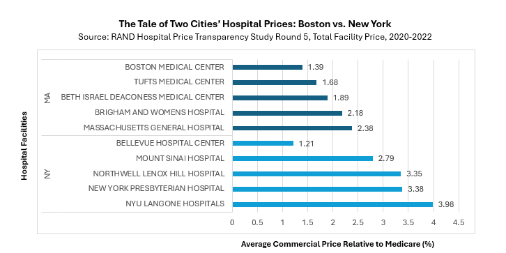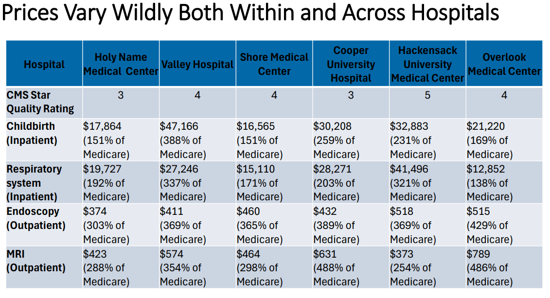 Continued investigation found that there was no correlation between high prices and quality of care. Furthermore, hospitals of the same quality rating had wildly different prices for the same procedures. In New Jersey, one 4-star hospital charges 388% of Medicare for an inpatient childbirth, while another 4-star New Jersey hospital charges 151% of Medicare for the same procedure. These prices also vary wildly within hospitals themselves, with some procedures costing 169% of the Medicare rate, and others costing 486% of the Medicare rate. Other major cities with high quality hospitals, such as Boston, MA, have less varied and lower prices overall, prompting the Fund to ask: “Why is there so much variety?”