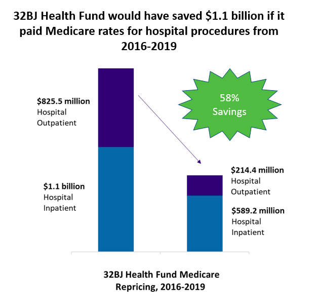 The 32BJ Health Fund analyzed its medical claims data to better understand what was causing the cost of their participants’ health benefit to rise so astronomically. They uncovered that hospital prices are the primary driver of cost increases to the Fund— with 44% of its spend going towards hospital care. Furthermore, they learned that they were paying much more, around 3x more on average, than Medicare pays for the same procedures. If the 32BJ Health Fund had paid Medicare rates for hospital procedures between 2016-2019, they would have saved $1.1 billion over that period as demonstrated in the graph below.